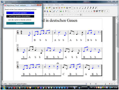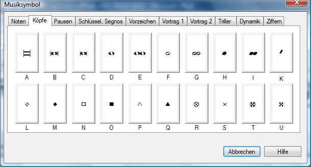 Für die Darstellung des Kreuzes als Kopf muss der Einfach-Text von Capella verwendet werden. Der ‚echte‘ Kopf wird unsichtbar dargestellt ( Noten markieren, Noten/Köpfe/kein Kopf ), danach Musiksymbole ( S im blauen Kreis ) anklicken und unter Köpfe das Symbol U auswählen und möglichst genau positionieren ( kleine Toleranzen lasse ich zwar zu, aber irgendwo ist Schluss, denn ich muss aus der relativen Position des Kreuzes den Ton ableiten ).