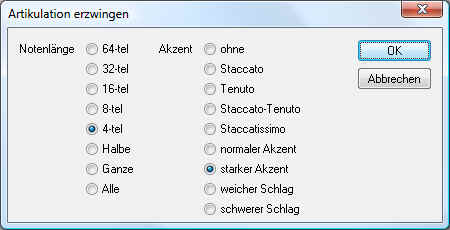 Artikulationszeichen auf alle Noten der ausgewählten Länge. Punktierungen