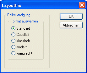 Die unter Format / Partiturformat gewählte Balkensteigung im Skript auswählen. Das Skript setzt die wichtigsten Parameter auf diese vordefinierten Capella-Standards zurück. |