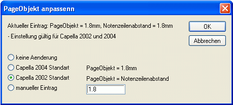 Mit Capella 2004 wird neu das PageObjekt eingeführt. Damit lässt sich die Textgröße der an der Seite verankerten Objekte bestimmen. In Capella 2002 und früher wurde diese Textgröße aus dem Notenlinienabstand der ersten Notenzeile ermittelt. Mit diesem Pythonskript kann das PageObjekt so gesetzt werden, dass es der Capella2002 Norm entspricht, und die Seiten in Capella 2004 und 2002 gleich aussehen.