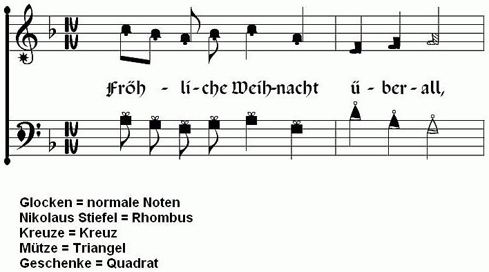 Bitte darauf achten, dass bei manchen Schriftbildern das Aussehen der Noten verschiedenen Notenköpfen zugeordnet ist