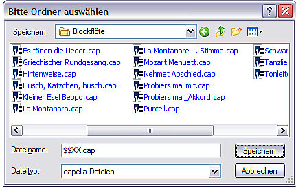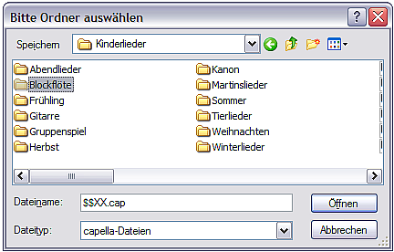 Bemerkung: Leider ist es mit dem Filedialog von Capella nicht möglich, Wildcards zu setzen. Aus diesem Grund muss das Filter in einem zweiten Schritt abgefragt werden.