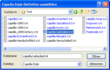 Die Dateien in einem Ordner, der sich nicht in Capella befinden muss, speichern. Beim Importieren der Notenschriftarten werden bestehende Definitionen in capella.dat überschrieben. Sämtliche notwendige Einträge in capella.dat übernimmt das Skript. Die Styles werden alphabetisch geordnet, wobei capella-Standard immer an erster Stelle steht.